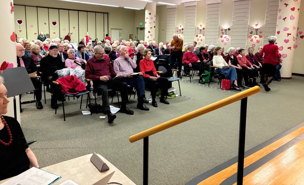Then I had not a lot to do until after lunch. About 2 I went to the auditorium and did all the tech setup for the Good Times Valentine’s Day show. Then I had more time to kill, then went to early supper at 5. Finally got to be showtime. Here’s the audience before the show.