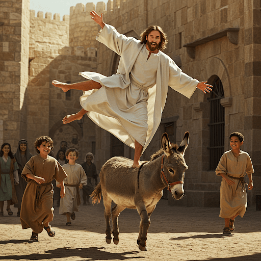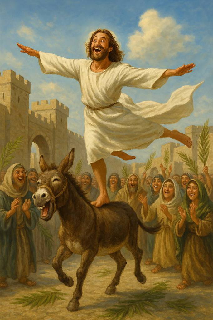 As Jesus enters Jerusalem he is practicing his circus bareback riding act. He is standing on one leg on the back of a trotting donkey, the other leg extended out to the side. Jesus’s white robe flaps behind him, his arms are spread out to catch the wind, a look of pure glee on his face. The donkey is hee-hawing in glee. Citizens of Jerusalem look on in awe and glee.