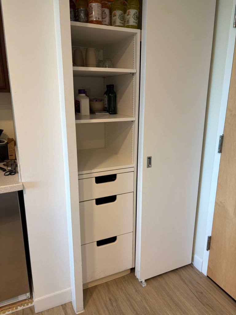 My self-assigned project today was to clean up my pantry. This is a set of shelves and drawers to the right of my tiny kitchen area. It is old; the original 1960s woodwork from when the place was built. Here’s the pantry now, after cleaning and reorganizing.