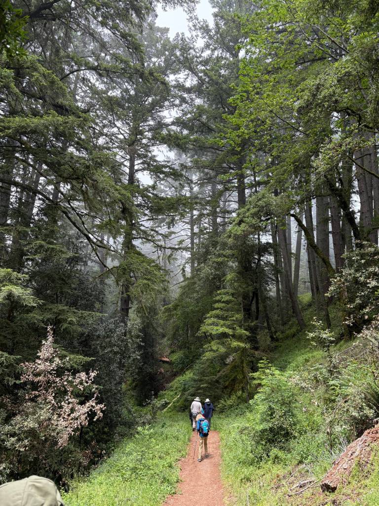 The total route was just under 4 miles, which is long for both of us, and included a couple of long uphills and downhills. We left in bright sun but the normal summer fog bank was sitting on top of the hills (see picture) and it was chilly and damp in the woods.