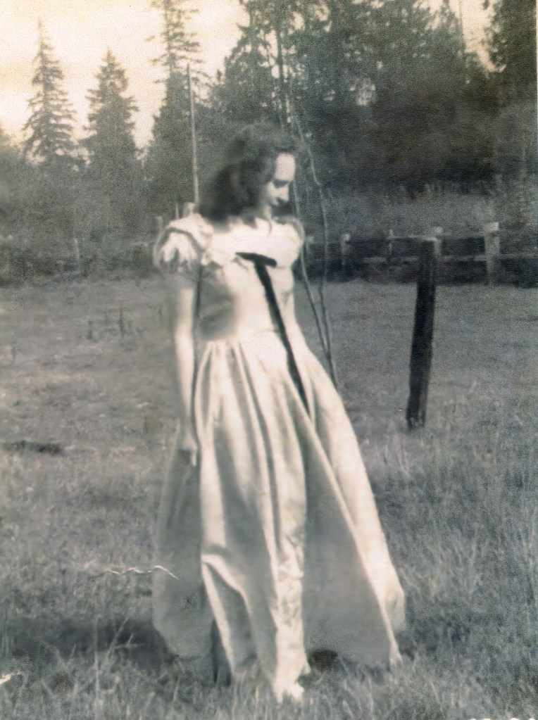 At various times in the afternoon I uploaded some of the pictures from Joyce’s book to the Family Album gallery. They aren’t in one place, they are spread out in their proper year order. The quality of these images, being scanned from a page of a xeroxed book, is not very good, but some are worth keeping regardless. Like the girls at 8 and 10 (yesterday), or this one of Joyce in her senior prom dress, which she says she made.