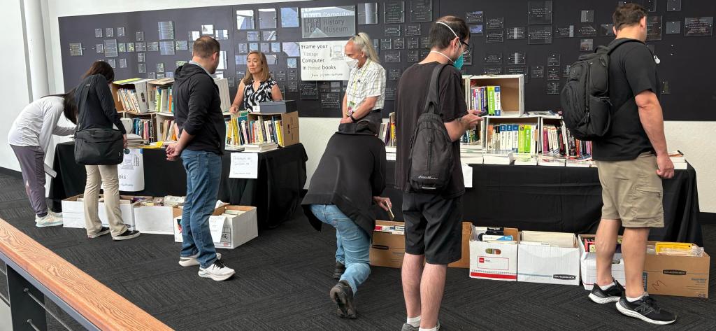 Like yesterday, out at 8am to pick up Frank and go set up for the 9am opening of the Vintage Computer Fest. At the end they announced the attendance had be 3,800 for the two days. It was crowded and busy the whole time. We went down with 31 boxes of stuff, here’s Fred carrying 16 of them.