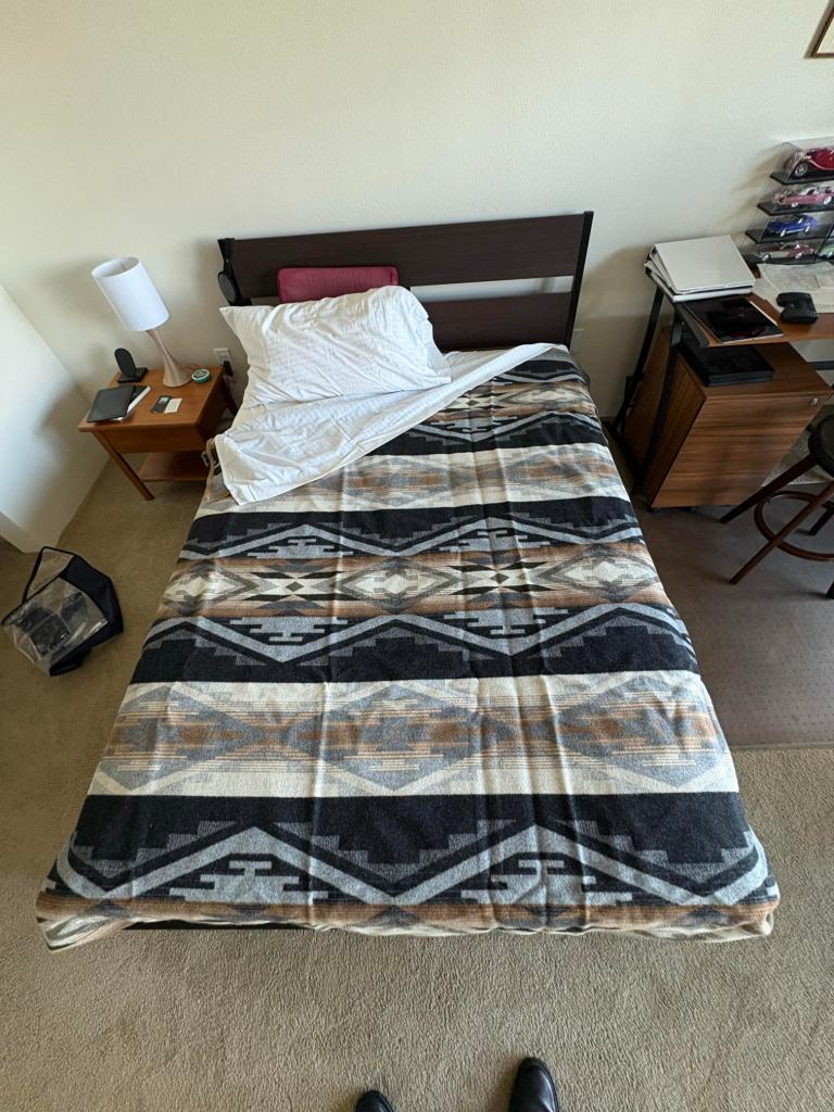 Oh, a couple days ago my new Pendleton blanket arrived. First new bedding for a few years. Here it is new out of the package, with creases.