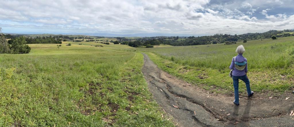 Morning project was to take a hike. Joanne had organized it, and other walkers were me, Joanne #2 and her partner Erika. Martha was to come but begged off at the last minute. So in Joanne #2’s car off to Arastradero preserve. It was a very nice day, cool with clouds and everything green.