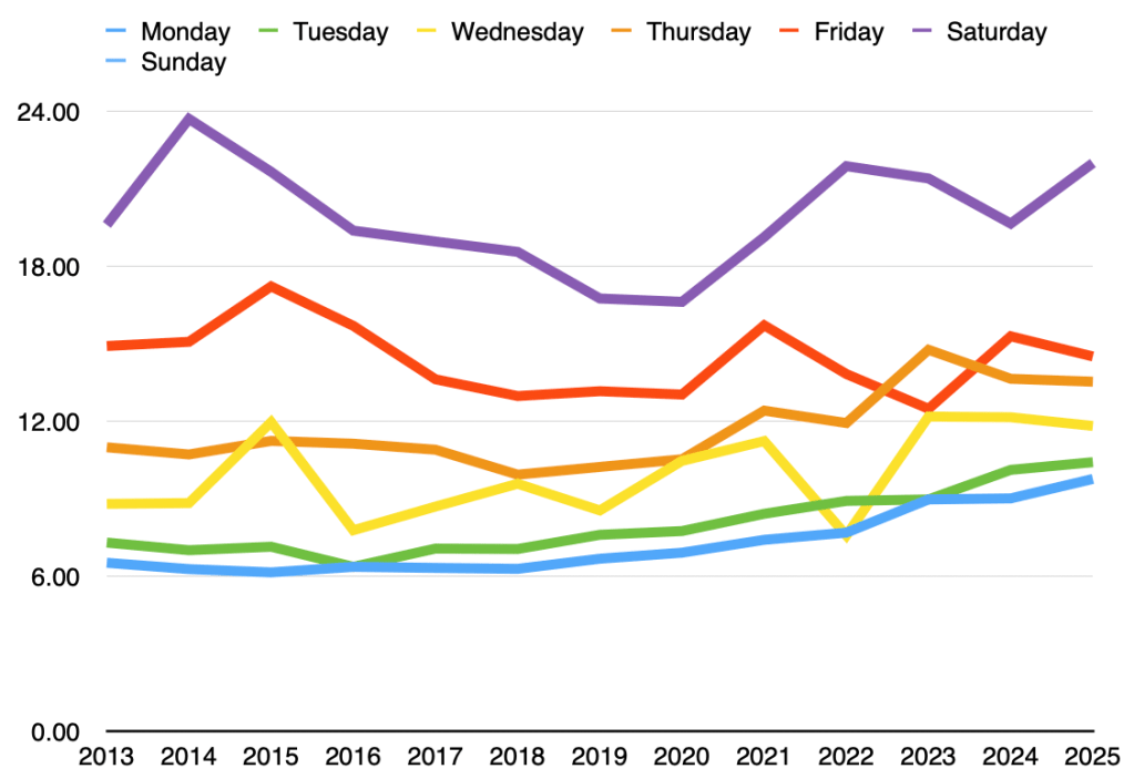 The picture for the other days of the week isn’t as clear. (I think the jumps around 2014-15 must reflect a change of editors, or something systematic that made all the puzzles harder in 2015, and then went back to normal.) Looking at Wed-Thu-Fri, from 2020 on, I had slightly faster times for 2025 versus 2024. That would be reassuring except for the spike in Saturday times.
